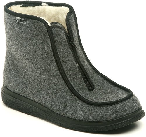 Dámské kotníčkové zimní důchodky se zapínáním na zip.<br /> <br /> Obuv je vyrobena z textilního filcového materiálu. Vnitřní část je vybavena textilním chlupatým kožíškem.<br /> <br /> Váha jednoho páru = 450 g<br /> <br /> Dámské zimní boty typu důchodky.